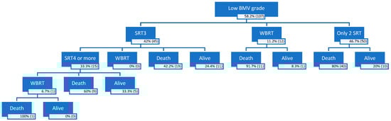 One hundred and three patients (66.8%) received a total of two sessions of SRT; SRT1 was delivered at the time of the treatment of the first BMs and SRT2 was delivered at the time of the treatment of the locally recurrent BM or distant brain failure. Thirty-nine patients (21.2%) underwent two locally recurrent BMs or distant brain failure and received three SRT sessions. Fourteen patients (7.6%) underwent three locally recurrent BMs or distant brain failure and received four SRT sessions. Seven patients (3.8%) underwent four locally recurrent BMs or distant brain failure and received five SRT sessions. Additionally, one patient (0.5%) underwent five locally recurrent BMs or distant brain failure and received six SRT sessions. Figure 1 shows the patient outcomes according to the BMV grade starting from SRT2.