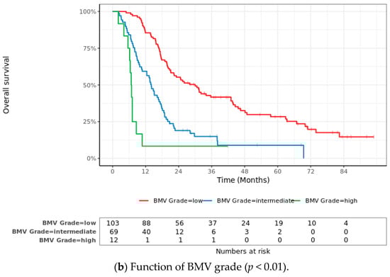 Overall survival. (a) Function of the total number of SRT sessions; (b) Function of BMV grade 3.5. Neurological death-free survival.