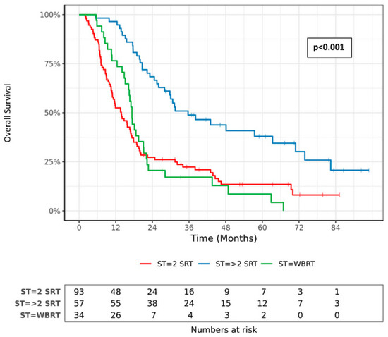 Overall survival according to salvage treatment. ST: Salvage Treatment; SRT: Stereotactic Radiotherapy; WBRT: Whole-Brain Radiotherapy.