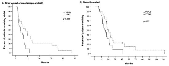 The median TTNC of patients treated with first-line PLD was 4.9 months (95% CI 2.5–7.3) compared to 9.9 months (95% CI 2.3–17.5) in patients treated with first-line taxane, p = 0.006 (Figure 1A). Median OS after initiation of first-line chemotherapy with PLD was 17.8 months (95% CI 12.2–23.5) and 24.6 months (95% CI 16.7–32.6) with first-line taxane, p = 0.05 (Figure 1B). The median PFS of patients receiving first-line PLD was 4.4 months (95% CI 0.93–7.8) as compared to 9.0 months (95% CI 5.4–12.7) in patients receiving first-line taxane, p = 0.005. All patients in group PLD were evaluable for response, and four patients in group TAX were non-evaluable due to missing data. There was no complete remission in either group. ORR was 13% in group PLD as compared to 53% in group TAX, p = 0.01. The clinical benefit rate did not differ significantly between groups (52% in group PLD, 73% in group TAX, p = 0.2).