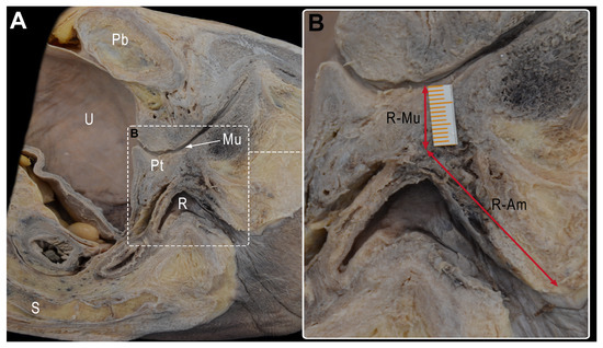 (A) Medial view of the left side of a sagittal sectioned pelvis. (B) Magnification of rectourethral area with measurements of R-Mu distance between the anterior surface of the rectum and the membranous urethra and R-Am distance between the point on the anterior wall of the rectum closest to membranous urethra and the anal margin. Pb: pubis; U: urinary bladder; Pt: prostate; Mu: membranous urethra; R: rectum; S: sacrum.