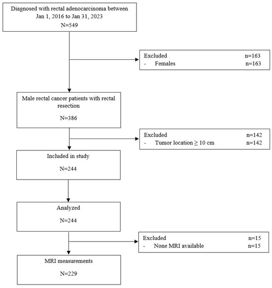 We retrospectively analyzed consecutive cases from the prospectively maintained database in our tertiary care department of male patients with tumors located <10 cm from the anal verge who underwent curative elective rectal cancer surgery other than transanal minimally invasive surgery or local resection between January 2016 and January 2023 (Figure 3).