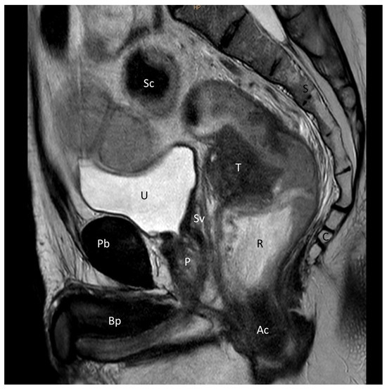 Sagittal T2-weighted MRI view of a male pelvis showing rectal cancer located 6 cm anteriorly to the left. The cancer was staged as T3N2aM0. Pb: pubis; U: urinary bladder; Bp: Body penis; P: Prostate; Sv: seminal vesicle; R: rectum; S: sacrum; Sc: sigmoid colon; T: tumor; C: coccyx; Ac: anal canal.