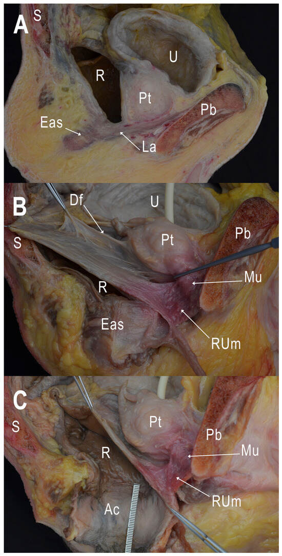 Dissection of the medial view of the left side of a sagittal sectioned pelvis. (A) Sagittal section before dissection. (B) Dissection of the supralevator space. Identification of Denonvilliers’ rectovesical septum and fibromuscular transversal tissue bundles of the rectourethral muscle. The external anal sphincter around the anal canal is maintained. (C) Exposition of the anal canal after removing of the external anal sphincter. Pb: pubis; S: sacrum; U: urinary bladder; Pt: prostate; R: rectum; La: levator ani muscle; Eas: external anal sphincter; Df: Denonvilliers’ fascia; Mu: membranous urethra; Rum: rectourethral muscle; Ac: anal canal.