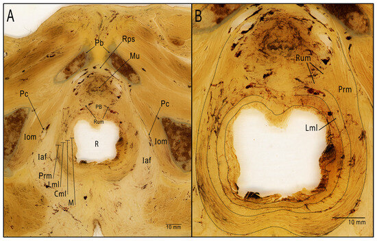 Semi-thin transversal section (1500 µm) of a male pelvis showing the relationship between the anterior wall of the rectum and the membranous urethra. (A) We can observe the perineal body and the rectourethral muscle beside it. (B) Magnification of the rectourethral area. Identification of the rectourethral muscle and its relationship with the layers of the rectum and puborectalis muscle. Pb: pubis; Rps: retropubic space; Mu: membranous urethra; PB: perineal body; Rum: rectourethral muscle; R: rectum; M: mucosa of rectum; Cml: circular muscular layer; Lml: longitudinal muscular layer of rectum; Prm: puborectalis muscle; Iaf: ischioanal fossa; Iom: internal obturator muscle; Pc: pudendal canal.