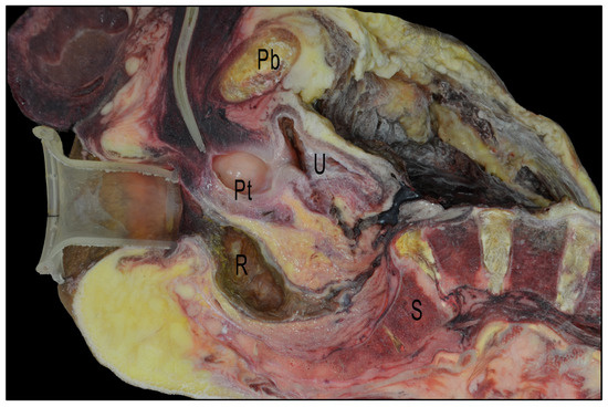 Sagittal section of a cryopreserved cadaveric pelvis with GelPOINT® Path Transanal Access Platform and a urinary catheter inserted. Pb: pubis; U: urinary bladder; Pt: prostate; R: rectum; S: sacrum.