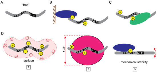 Transport states of YAP/TAZ. (A) “Free”, transport-competent YAP/TAZ. (B–D) Posttranslational modifications and interactions with other proteins could (B) tether YAP/TAZ to macromolecular complexes (e.g., plasma membrane, chromatin), (C) mask their transport signals (i.e., NLS or NES), or (D) change their physicochemical properties (1: surface charge, 2: size, 3: mechanical stability) to diminish nucleocytoplasmic shuttling.