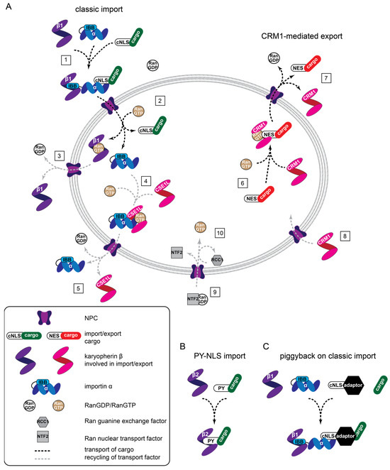 Nuclear transport machines and different transport modalities. (A) General overview of classic protein import (1, 2), CRM1-mediated export (6, 7), and the recycling of factors supporting transport (3–5, 8–10). (1) Assembly of a heterotrimeric import complex, NPC passage, and (2) RanGTP-driven disassembly. Importin β1-RanGTP complexes cycle back to the cytoplasm where (3) hydrolysis of GTP to GDP triggers Ran dissociation. (4) CSE1L associates with RanGTP and importin α, passes the NPC, and (5) releases importin α into the cytoplasm. (6) Similarly, CRM1 associates with RanGTP and an NES-containing cargo for (7) nuclear export, followed by (8) CRM1 reentering the nucleus. (9) RanGDP is transported into the nucleus by NTF2 and RCC1 catalysis is the exchange of GTP for GDP (10) to maintain the RanGDP/RanGTP gradient across the nuclear envelope. (B) Transportin-mediated import involves direct binding between karyopherin-β2 (transportin) and cargo. (C) Classic, piggyback import involves an NLS containing an adaptor that bridges importin α and the cargo. IBB: importin β binding.