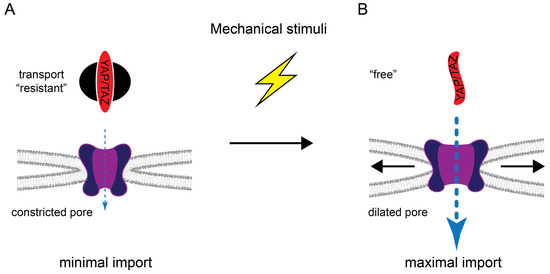 Novel insights into the mechanoresponsive regulation of YAP import came from the groundbreaking work of the Roca-Cusachs lab [93,109]. The group showed that mechanical cues are transmitted to the nucleus via the cytoskeleton-LINC complex axis, leading to deformation of the nuclear envelope and, thereby, widening the pore diameter of the embedded NPCs (Figure 3).