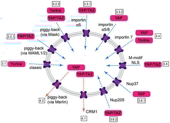 Summary of nuclear import and export pathways for Yorkie, YAP, and TAZ. Import routes are indicated by blue dotted arrows, export routes by red ones. Identified features of the transport and boxed section numbers are indicated.