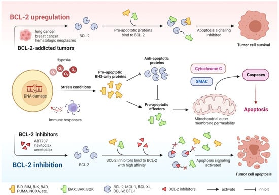 Apoptosis is a highly orderly fundamental cellular process that occurs under physiological and pathological conditions and helps to clear abnormal cells to maintain homeostasis. Defects in apoptosis are important mechanisms of tumor development and drug resistance [39]. Apoptosis is induced through two major pathways: the extrinsic death receptor pathway and the intrinsic mitochondrial pathway. The prosurvival and proapoptotic members of the BCL-2 family of proteins coregulate the intrinsic pathway to balance cell survival or death [40]. The BCL-2 family members can be classified into three categories according to their function and structure, namely antiapoptotic proteins (BCL-2, BCL-XL, MCL-1, BCL-W, and BFL1), proapoptotic proteins (BAK, BAX, and BOK), and proapoptotic BH3-only proteins (BID, BIK, BIM, BAD, NOXA, PUMA, etc.) [41]. Under various stress conditions, such as hypoxia, DNA damage, and immune responses, BH3-only proteins are upregulated and activated and then bind to antiapoptotic proteins (e.g., BCL-2) through their BH3 domains to exert inhibitory effects. Inhibition of BCL-2 fails to sequester proapoptotic effectors, resulting in its activation upon release. After activation, oligomerized BAK and BAX cause increased permeability of the outer mitochondrial membrane, which leads to the release of apoptotic factors such as cytochrome c and a second mitochondria-derived activator of caspase (SMAC) from the mitochondria. This ultimately results in cell apoptosis through the activation of the caspase cascade reaction [42]. Based on this, it is rational and anticipated to develop effective small-molecule inhibitors of antiapoptotic proteins as novel approaches to target apoptosis. These inhibitors are called BH3 mimics and can bind to antiapoptotic proteins to inhibit their activity and function, thereby promoting proapoptotic proteins to induce apoptosis (Figure 2).