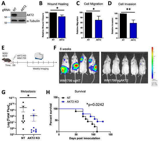 In order to confirm these findings with a more robust depletion of AKT2, we utilized isoform-specific CRISPR/Cas9 knockout in WM1799 cells for which we previously confirmed stable isoform-specific knockout (Figure 5A and Figure S4A) [33]. We first characterized the properties of AKT2 knockout (KO) WM1799 cells compared to nontargeting (NT) cells in vitro, as was carried out for the inducible knockdown cell lines (Figure 1 and Figure 2). As expected, and in line with our results using inducible knockdown, we found that the AKT2 KO cells had impaired wound healing (scratch assay), migration (trans-wells), and Matrigel invasion when compared to the NT cells (Figure 5B,D), which are all indicative of impaired metastatic properties. In order to test this, we further engineered NT and AKT2 cells to express luciferase and injected them into the tail veins of NOD SCID mice (Figure 5E). At 8 weeks post-inoculation, the NOD SCID mice that received AKT2 KO cells had significantly lower metastatic burden than those injected with NT cells (Figure 5F,G). Further, the mice injected with AKT2 KO cells showed a survival benefit relative to NT-injected mice (Figure 5H), which is consistent with the previous results, indicating that AKT2 depletion delays the onset of metastatic disease and overall survival.