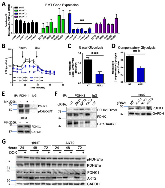 AKT2 depletion alters EMT and impairs glycolysis in melanoma cells. (A) RT-qPCR analysis of EMT and invasion-associated transcripts in WM1799 shNT, AKT1 KD, AKT2 KD, or AKT3 KD cells after 48 h of DOX treatment from three independent experiments. Expression levels were normalized to shNT cells. (B) Representative GRA plot shows the proton efflux rate (PER) of WM1799 shAKT2 cells cultured in DMSO- or DOX-containing media for 48 or 72 h, which was used to quantify basal glycolysis (C) and compensatory glycolysis (D) in DOX-treated WM1799 shNT cells from three independent experiments. (E) PDHK1 immunoprecipitation was performed after 24 h of MK-2206 treatment, and then immunoblotting was performed for AKT consensus site phosphorylation, with the input immunoblot for PDHK1 shown in the lower panel. (F) PDHK1 immunoprecipitation was performed on isoform-specific CRISPR KO WM1799 cells, then immunoblotting was performed for AKT consensus site phosphorylation. (G) Immunoblot analysis of PDHK1 expression or PDHE1a expression and phosphorylation in WM1799 shNT or AKT2 KD after treatment with DOX for indicated time points. ns: no significant difference. **: p < 0.01, ***: p < 0.001.