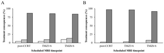Treatment consequences for scheduled follow-up scans. Percentage of treatment consequences (y axis) for the different scheduled follow-up MRI scan timepoints (x axis). Treatment consequences based on MRI together with clinical parameters (A) and treatment consequences solely based on MRI (B) are shown. Number of minor (white bars), major (light gray bars), and no consequences (dark gray bars) on treatment for each timepoint are shown. The post-operative (post-OP) timepoint is not included as it never resulted in any consequences on treatment. Abbreviations of scan timepoints: post-CCRT = post-concomitant chemoradiotherapy; TMZ3/6 after three cycles of adjuvant temozolomide chemotherapy; TMZ6/6 = after six cycles of adjuvant temozolomide chemotherapy which marks the completion of standard treatment.