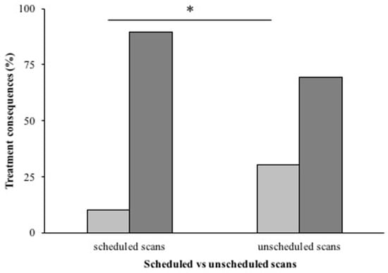 Treatment consequences for scheduled and unscheduled scans. Percentage of major treatment consequences (in light gray bars) compared to no or minor treatment consequences (dark gray bars) for both scheduled follow-up scans (left) and unscheduled scans (right). Unscheduled scans resulted in significantly more major treatment consequences than scheduled scans (* = p < 0.001).