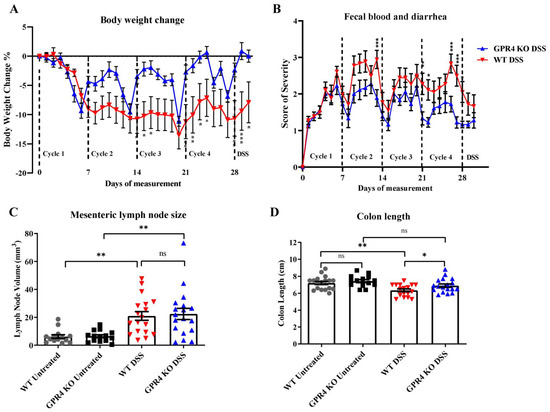 Nine-week-old male and female wild-type (WT) and GPR4 knockout (KO) mice were used in the experiments. GPR4-deficient mice were generated as previously described and were backcrossed into the C57BL/6 background for 11 generations [19]. Animals were maintained under specific pathogen-free conditions and were free from Helicobacter, Citrobacter rodentium, and norovirus. Colitis was induced using 3% (w/v) colitis-grade dextran sulfate sodium (DSS) with molecular weight 36,000–50,000 Da (Lot# Q1408, MP Biomedical, Solon, OH, USA) within the drinking water of the mice. The 3% DSS solution or water was provided to mice ad libitum, as previously described [16,31,32]. Briefly, mice were given 3% DSS for 4 cycles. Each cycle constituted 5 days of 3% DSS followed by 2 days of water. Following the fourth cycle, water was switched back to 3% DSS for 2 final days. Mouse body weight and clinical phenotype scores were measured each day [33].