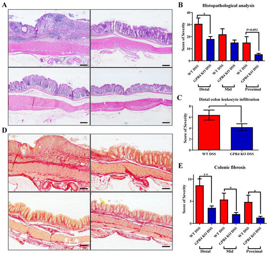 Histopathological analysis of proximal, middle, and distal colon in chronic colitis mice. Characteristic histopathological features of colitis were assessed to further characterize the degree of intestinal inflammation. WT-DSS mice presented elevated disease indicators compared with GPR4 KO-DSS mice. Representative H&E pictures of distant colon were taken for (A) WT-DSS, GPR4 KO-DSS, WT control, and GPR4 KO control mice. (B) Total histopathologic scores for WT-DSS and GPR4 KO-DSS proximal, middle, and distal colons. For fibrosis assessment, representative pictures of Picrosirius red-stained tissue sections of distant colon were taken for (D) WT-DSS, GPR4 KO-DSS, WT-control, and GPR4 KO control mice. Graphical representations of (B) total histopathological parameters, (C) leukocyte infiltration assessment in the distal colons, and (E) colonic fibrosis are presented. WT control (n = 18), WT-DSS (n = 17), GPR4 KO control (n = 14), and GPR4 KO-DSS (n = 18) mouse tissues were used for histopathological analysis. Scale bar is 100 µm. Data are presented as the mean ± SEM, and statistical significance was determined using an unpaired t-test between the WT-DSS and GPR4 KO-DSS groups (* p < 0.05, ** p < 0.01).