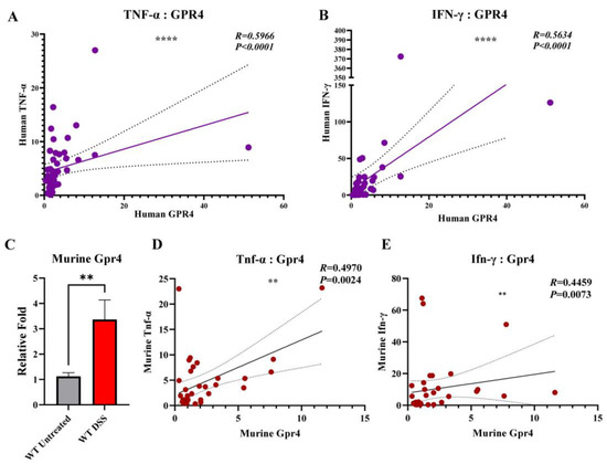 GPR4 gene expression in the inflamed colon tissues and correlation with inflammatory mediators. GPR4 gene expression is correlated with inflammatory mediator TNF-α and INF-γ gene expression in colon tissue samples of IBD patients. A positive correlation was found between (A) GPR4 and TNF-α and (B) GPR4 and IFN-γ relative mRNA expression in IBD patient samples. Statistical significance was tested with the Pearson correlation coefficient. Dashed lines indicate the 95% confidence band of the best-fit line with the linear regression analysis. (C) Upregulation of murine GPR4 gene expression in WT-DSS inflamed colon tissues compared with the control. Correlation between (D) murine GPR4 and TNF-α and (E) Gpr4 and Ifn-γ relative mRNA expression in WT-DSS and control mouse colon samples. Statistical significance was tested using Pearson or Spearman correlation coefficient (** p < 0.01, **** p < 0.0001).
