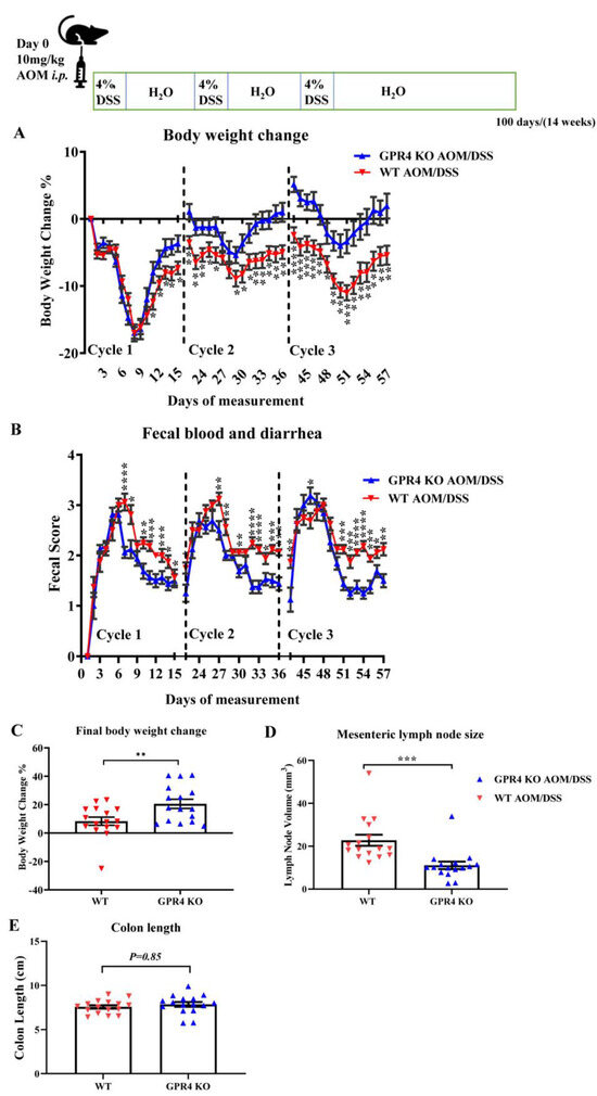 To further study the role of GPR4 in the development of colitis-associated colorectal cancer (CAC), we utilized the well-established AOM/DSS murine model [41,42]. Disease severity indicators were measured during the experiment by monitoring body weight loss and fecal blood and diarrhea scores. The WT AOM/DSS mice showed more significant body weight loss when compared with the GPR4 KO AOM/DSS mice starting at the end of the first cycle and throughout the second and third cycles. Both the WT and GPR4 KO AOM/DSS mice reached an average body weight loss of ~17% by day 9 during the first cycle, followed by a partial recovery in body weight loss. This body weight recovery was more significant in the GPR4 KO mice than the WT mice (Figure 4A). The severity of fecal blood and diarrhea scores was also significantly higher in the WT AOM/DSS mice in comparison with the GPR4 KO AOM/DSS mice (Figure 4B). At the endpoint of the experiment (day 100), macroscopic disease indicators were evaluated, such as final body weight, mesenteric lymph node expansion, and colon length shortening. The GPR4 KO AOM/DSS mice showed a significant increase in body weight recovery compared with the WT mice (Figure 4C). The mesenteric lymph node volume of the WT mice was larger than that of the GPR4 KO mice, indicating a more severe intestinal inflammation in the WT mice (Figure 4D). No significant differences were observed in colon length between the WT and the GPR4 KO AOM/DSS-treated mice (Figure 4E).