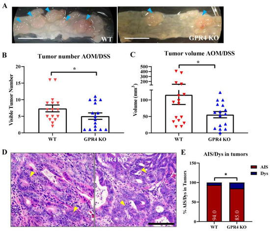 Effects of GPR4 on tumorigenesis in the colitis-associated colorectal cancer (CAC) mouse model. Tumor burden was evaluated using clinical observation of tumor number and tumor volume at the endpoint for WT AOM/DSS (n = 16) mouse colons compared with GPR4 KO AOM/DSS mouse colons (n = 16). Tumor burden was found to be higher in WT AOM/DSS mouse colons compared with GPR4 KO AOM/DSS mouse colons. (A) Representative pictures of distal colons bearing tumors (indicated by blue arrowheads), (B) tumor number, (C) tumor volume, (D) histopathological representation of adenocarcinoma in AOM/DSS mouse colons (yellow arrowheads), and (E) distribution of adenocarcinoma in situ (AIS) and low-grade dysplasia (Dys) in WT AOM/DSS and GPR4 KO AOM/DSS mouse tumors. Data are presented as the mean ± SEM, and statistical significance was determined using an unpaired t-test and a chi-square test between WT AOM/DSS and GPR4 KO AOM/DSS mice (* p < 0.05). Scale bar in (A) is 1cm, and scale bar in (D) is 100 µm.