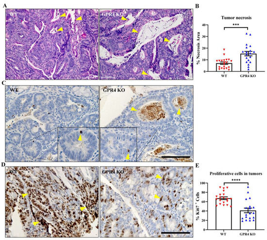 Tumor necrosis is considered a common feature of solid tumors, which occurs as a consequence of nutrient and oxygen deprivation [43]. Areas in the tumors with apparent gaps resulting from transformed crypt loss were identified as necrotic areas, where remnants of nuclear and cytoplasmic debris were visualized with H&E stain (Figure 6A). The percentage of tumor necrosis areas between the WT and GPR4 KO AOM/DSS tumors was ~ 2.4-fold higher in the GPR4 KO AOM/DSS tumors compared with the GPR4 WT AOM/DSS tumors (Figure 6A,B). Using immunohistochemistry, we assessed the protein expression of cleaved caspase-3, a marker of programmed cell death, in WT and GPR4 KO AOM/DSS tumors. The expression of cleaved caspase-3 was predominantly detected in the necrotic tumor area in addition to positive epithelial cells scattered within the tumor (Figure 6C). Next, we evaluated Ki67 as a proliferation marker to assess tumor cell proliferation in the WT and GPR4 KO AOM/DSS mice. WT AOM/DSS tumors showed a more proliferative phenotype when compared with GPR4 KO AOM/DSS tumors (Figure 6D). The quantification of Ki67-positive cells revealed a ~two-fold decrease in proliferating tumor cells in GPR4 KO AOM/DSS mouse tumors (Figure 6E).