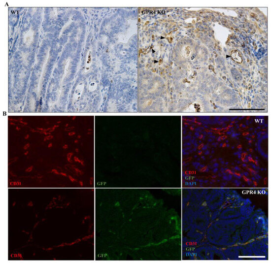 GFP signal and double labeling with CD31 in the colon tumor tissues of the colitis-associated colorectal cancer (CAC) mouse model. GFP knock-in under the control of the GPR4 promoter serves as a surrogate marker for endogenous GPR4 expression in GPR4 KO mice. GFP expression could be detected via immunohistochemistry in GPR4 KO mice but not in WT mice. (A) GFP expression (indicated by black arrowheads) in GPR4 KO AOM/DSS tumors versus no expression in WT AOM/DSS tumors and (B) double labeling of GFP (green) and CD31 (red). Blood vessels show double-positive signals for GFP and CD31 in the GPR4 KO AOM/DSS tumors versus only a CD31-positive signal in the WT AOM/DSS tumors. Scale bar is 100 µm.