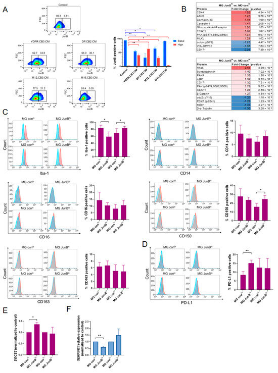 In the current study, RNA-sequencing (RNA-seq) analysis showed that treating human microglia cells with soluble factors derived from MBM upregulated the expression of the transcription factor JunB in microglia. JunB is a component of the activator protein-1 (AP-1) dimeric transcription factor, which is composed of homodimers or heterodimers of proteins that belong to the Jun, Fos, and activating transcription factors (ATF) subfamilies [8].