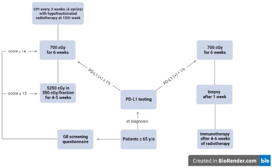 Patients with a positive PD-L1 defined as 1% or higher should undergo immunotherapy with CPIs every three weeks for 12 weeks (four cycles) []. Hypofractionated radiotherapy will be started at week 12 concurrently with immunotherapy or earlier for disease progression. Fit patients may be treated to a dose of 5250 cGy in 350 cGy/fraction (BED = 7087 cGy) or a similar BED regimen over four to five weeks depending on tumor location to ensure a good cosmesis. Frail patients may be treated with a weekly hypofractionation of 700 cGy for six weeks (BED = 7140 cGy) per clinician discretion []. Immunotherapy will be continued every three weeks following radiotherapy until disease progression, excessive toxicity, or physician discretion to ensure a balance between treatment toxicity and patient QOL for this vulnerable population.