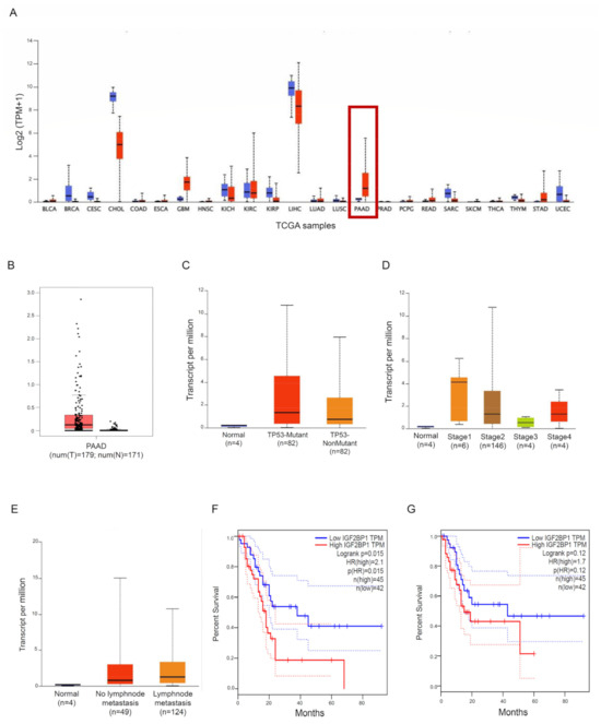 IMP1 expression is increased in PDAC tissue. (A) IMP1 expression in several types of human cancer was explored with the TIMER database; red box: normal pancreatic tissue vs. PDAC tissue. (B) Expression of IMP1 mRNA in PDAC tissue and normal tissues using the GEPIA database. Box plots indicate IMP1 expression among distinct groups of patients based on clinical parameters: TP53 mutation (C), cancer stage (D), and nodal metastasis status (E) using the UALCAN online tool. Kaplan–Meier plotters are displayed for overall survival (F) and disease-free (G) survival using the GEPIA database.