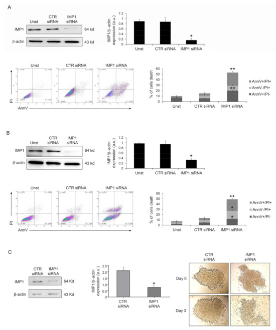 Because IMP1 operates as a post-transcriptional fine-tuner that controls the expression of some important mRNA targets necessary for the regulation of cell proliferation and growth in several solid tumors, we evaluated whether IMP1 had a role in PDAC proliferation/survival. IMP1 protein expression was abrogated in human PDAC Panc-1 cells with a specific siRNA (Figure 2A), and cell treatment with the IMP1 siRNA for 48 h substantially increased their susceptibility to spontaneous cell death (Figure 2A). Similar results were also obtained in MIA PaCa-2 human pancreatic cancer cells (Figure 2B). Furthermore, treatment with BTYNB, an inhibitor of IMP1 RNA binding [21], had a similar effect on Panc-1 cell death (Supplementary Figure S1). The effects of IMP1 siRNA-induced cell death and viability were further evaluated in Panc-1 three-dimensional spheroids. IMP1 siRNA-treated spheroids exhibited a significant reduction in IMP1 expression and rapidly decreased in size and lost their three-dimensional structure (Figure 2C).