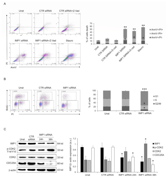 Cells were left untreated or treated with either control siRNA (final concentration 25 nmol/L) or IMP1 siRNA (final concentration 25 nmol/L) with or without Z-VAD-FMK (final concentration: 20 μmol; R&D Systems, Minneapolis, MN, USA). Cells were collected, washed twice in Annexin V (AnnV) buffer, stained with FITC-AnnV (final dilution: 1:100; Immunotools, Friesoyte, Germany) according to the manufacturer’s guidelines, and incubated with propidium iodide (PI) (5 mg/mL) for 30 min at 4 °C. Cell death was quantified using flow cytometry. For cell-cycle distribution, cells were untreated or transfected with CTR siRNA or IMP1 siRNA (final concentration 25 nmol/L) for 48 h and analyzed as previously indicated [11]. Cells were analyzed using flow cytometry Gallios and Kaluza software Version 2.1 (Beckman Coulter Life Sciences, Pasadena, CA, USA).