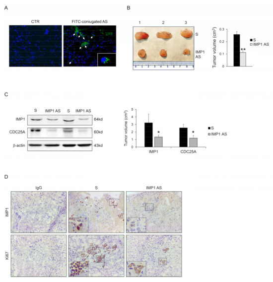 We examined the capacity of IMP1 to control cancer progression in vivo. Panc-1 cells were injected subcutaneously into RAG-1-deficient mice. After 7 days, mice were treated with an intraperitoneal dose of either phosphate-buffered saline (PBS; CTR) or fluorescein isothiocyanate (FITC)-conjugated IMP1-antisense oligonucleotide. After 24 h, mice were scarified, and the presence of FITC-IMP1 AS oligonucleotide with immunofluorescence was assessed in tumor tissue. FITC-IMP1 AS was taken up by cancer cells in the examined tumor tissue (Figure 5A), therefore, mice were treated daily by IP injection with either control sense (S) or IMP1 AS oligonucleotide (both at 100 mg/mouse) starting one week after the Panc-1 inoculation until sacrifice (day 21). No weight loss was detected in either treated group, and all mice remained alive until the end of the experiment. The Panc-1-originated cancer manifested in all animals, but mice that were treated with IMP1 AS oligonucleotide had a significantly reduced cancer volume (Figure 5B). Mice injected with IMP1 AS oligonucleotide but not with S had down-regulated IMP1 protein expression. Consistent with our in vitro results, silencing of IMP1 reduced CDC25A expression (Figure 5C,D). Finally, to examine whether the decrease in Panc-1-derived tumor volume detected in mice treated with IMP1 AS oligonucleotide was due to a cell proliferation reduction rate, we performed a Ki-67 cell proliferation assay (Ki67). Panc-1-derived tumors exhibited a reduced proportion of Ki67 positive cells, in agreement with the main findings of in vitro experiments.