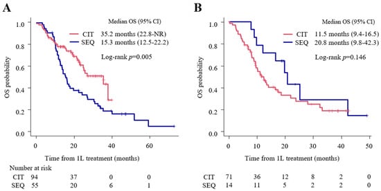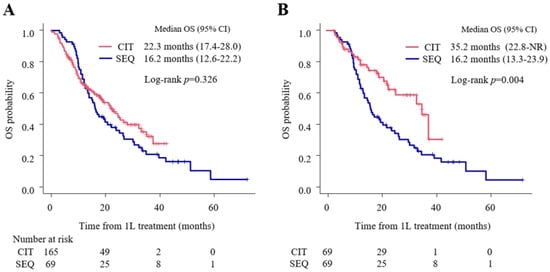 In the entire cohort (n = 234), the median OS of the first-line treatment was 22.3 months (95% CI: 17.4–28.0) in the CIT group and 16.2 months (95% CI: 12.6–22.2) in the SEQ group, without statistically significant differences (p = 0.326) (Figure 1A). However, the median OS in the propensity score-matched cohort (n = 138) was 35.2 months (95% CI: 22.8-not reached (NR)) in the CIT group and 16.2 months (95% CI: 13.3–23.9) in the SEQ group, showing a significantly longer OS in the CIT group (p = 0.004) (Figure 1B).
