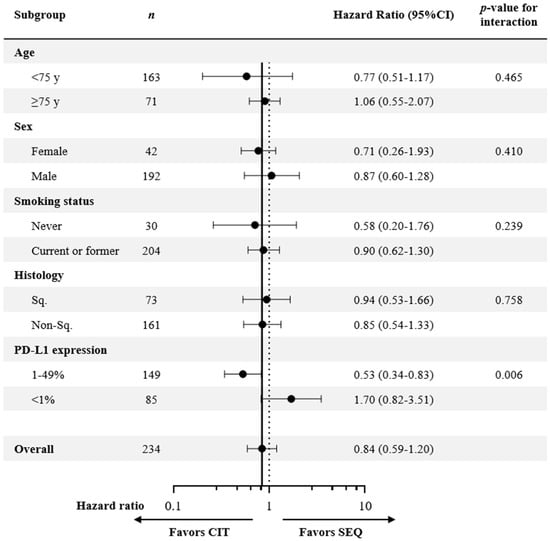 The survival curves crossed approximately one year after the start of first-line treatment in the overall cohort, in contrast with the propensity score-matched cohort, where CIT showed consistently superior survival rates. Therefore, a COX proportional hazards model was used to evaluate the interactions between each background factor in the CIT and SEQ groups. The COX proportional hazards model showed that the HR for OS in the 1–49% PD-L1 expression subgroup was 0.53 (95% CI: 0.34–0.83), while the HR for OS in the <1% PD-L1 expression subgroup was 1.70 (95% CI: 0.82–3.51), suggesting a significant interaction for PD-L1 expression (p = 0.006) (Figure 2).