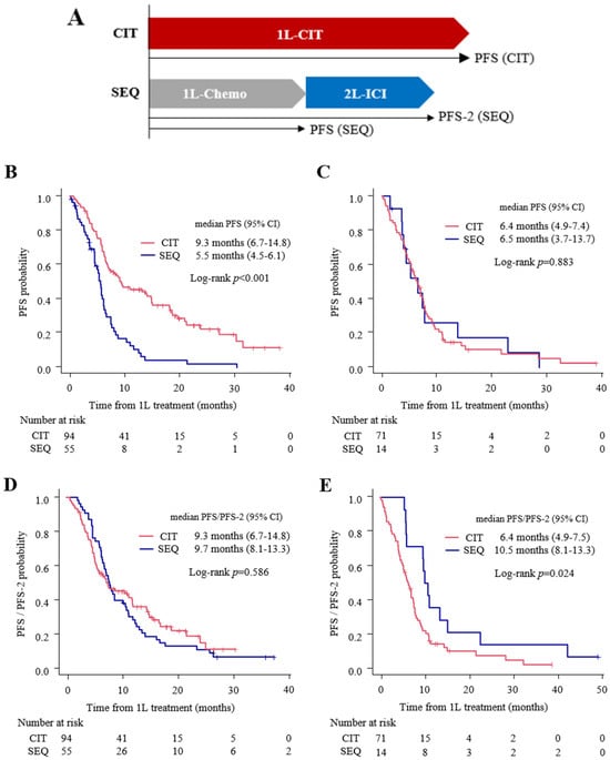 In the 1–49% PD-L1 expression subgroup, the CIT group exhibited longer median PFS than the SEQ group (Figure 4B; CIT: 9.3 months (95% CI: 6.7–14.8) vs. SEQ: 5.5 months (95% CI: 4.5–6.1); p < 0.001), while the median PFS in the CIT group was not statistically longer than the median PFS-2 in the SEQ group (Figure 4D; 9.7 months (95% CI: 8.1–13.3); p = 0.586). In contrast, there was no significant difference between the median PFS in the CIT and SEQ groups in the <1% PD-L1 expression subgroup (Figure 4C; CIT: 6.4 months (95% CI: 4.9–7.4) vs. SEQ: 6.5 months (95% CI: 3.7–13.7); p = 0.883). Furthermore, the median PFS-2 in the SEQ group was significantly longer than the median PFS in the CIT group among the <1% PD-L1 expression subgroup (Figure 4E; 10.5 months (95% CI: 5.9–15.3) vs. 6.4 months (95% CI: 4.9–7.5); p = 0.024).