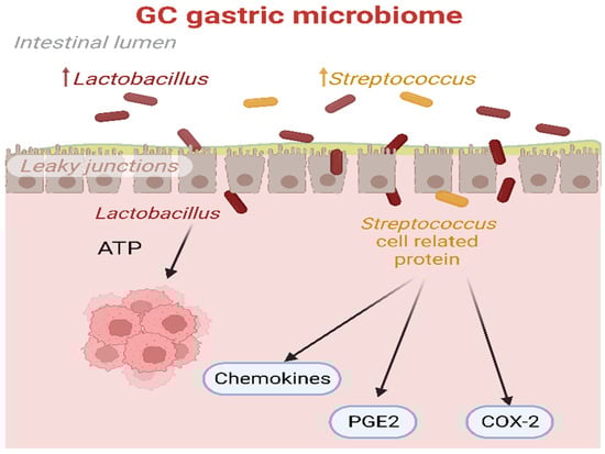On the other hand, as summarized in Figure 1, other studies have suggested that an excessive rise in Lactobacillus could be detrimental because lactic acid, produced by these bacteria, could act as an energy source for tumor cells and promote tumor proliferation and survival [70]. Consequently, it induces glycolytic enzymes, leading to an enhanced supply of ATP. It might also promote inflammation, tumor angiogenesis, and metastasis, further contributing to the complex dynamics of GC development [71,72].