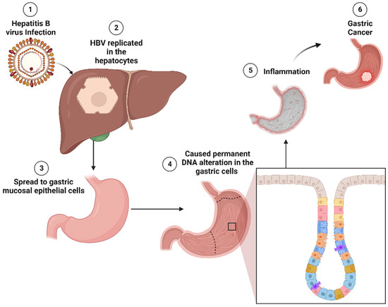 Specifically for HBV, as illustrated in Figure 2, upon infection, HBV replicates in the hepatocytes. It does not stay only in hepatocytes but also in extrahepatic tissues [108], including gastric mucosal epithelial cells. HBV DNA has been detected in 12.4% of GC tissues [130]. Based on gastric mucosa epithelial cells also infected with HBV, a study suggests that HBV infection may increase the risk of GC through an analogous mechanism to HBV-related hepatocellular cancer [131]. HBV may cause permanent DNA alteration in the gastric cells by changing the methylation status of cellular DNA, known as a “subthreshold neoplastic state” [132,133]. This, in turn, induces local inflammation in the stomach. Solid evidence supports inflammation as a pivotal factor in etiopathogenesis and ongoing tumor development [134].