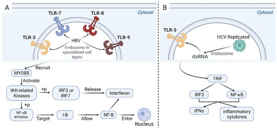 HCV infection has been primarily detected by cytosolic pattern recognition receptors and endosome membrane receptor toll-like receptor 3, the previously mentioned receptor, which promote the synthesis of interferons (IFNs) and inflammatory cytokines through different signaling pathways [156,157,158]. Illustrated in Figure 3B, HCV replicates and accumulated double-stranded RNA (dsRNA) intermediates, which are identified and then activated TLR3. This process subsequently leads to the activation of the toll/interleukin-1 receptor-domain-containing adapter-inducing interferon-β (TRIF). Consequently, the transcription factors IRF3 and NF-κB are activated, promoting the synthesis of interferons (IFNs) and inflammatory cytokines [157].