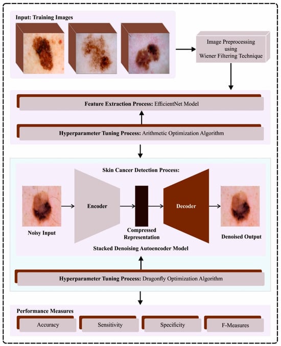 For skin cancer classification, the SDAE model is applied. Autoencoders (AEs) are allowed to convert high-dimension input data into low-dimension feature representations []. For improved robustness of AE, the DAE is capable of mapping real data instances for corrupted instances . Stacking multiple DAEs allows the input data that were compressed as distinct hidden spaces to be extracted for in-depth features. Therefore, the resultant layer of the SDAE is expressed as Equation (8):