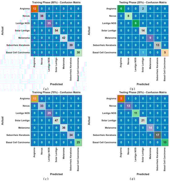 Confusion matrices at (a,b) 80:20 of TR phase/TS phase and (c,d) 70:30 of TR phase/TS phase.