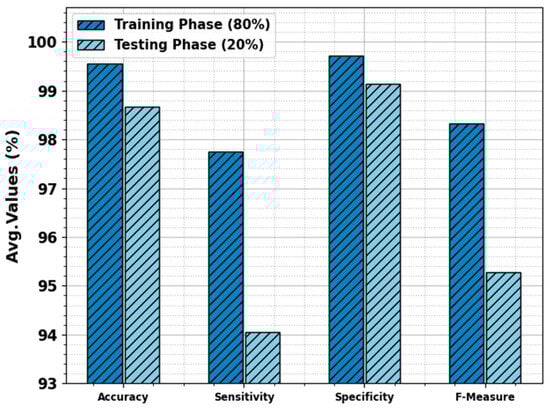 The skin cancer classification result of the ODL-SCDC technique is provided at 80:20 of the TR phase/TS phase in Table 2 and Figure 4. The experimental values inferred that the ODL-SCDC technique gains enhanced performance under all classes. With 80% of the TR phase, the ODL-SCDC technique offers average , , , and of 96.55%, 97.74%, 99.71%, and 98.33%, respectively. Additionally, with 20% of the TS phase, the ODL-SCDC system gains average , , , and of 98.66%, 94.05%, 99.14%, and 95.28%, correspondingly.