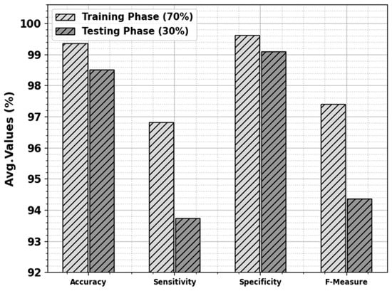 The skin cancer classification outcome of the ODL-SCDC technique is provided at 70:30 of the TR phase/TS phase in Table 3 and Figure 5. The simulation values implied that the ODL-SCDC method obtains higher outcomes under all classes. With 70% of the TR phase, the ODL-SCDC system attains average , , , and of 99.36%, 96.82%, 99.61%, and 97.41%, correspondingly. Furthermore, with 30% of the TS phase, the ODL-SCDC algorithm gains average , , , and of 98.51%, 93.73%, 99.10%, and 94.37%, correspondingly.