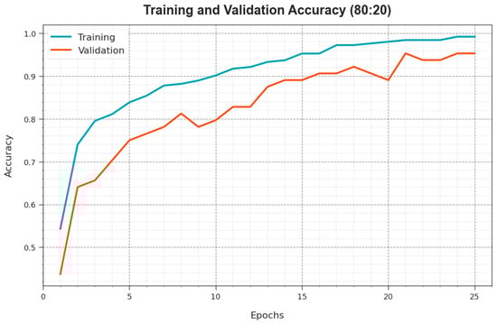 To calculate the performance of the ODL-SCDC approach at 80:20 of the TR phase/TS phase, TR and TS curves are determined, as revealed in Figure 6. The TR and TS curves establish the performance of the ODL-SCDC model over several epochs. The figure provides meaningful details regarding the learning task and generalisation abilities of the ODL-SCDC model. With an enhanced epoch count, it is noticed that the TR and TS curves are improved. It is experimental that the ODL-SCDC algorithm obtains better testing accuracy which has the capability of recognizing the patterns in the TR and TS data.