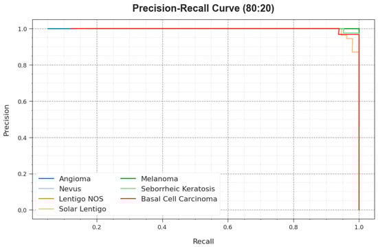 The precision–recall curve of the ODL-SCDC system at 80:20 of the TR phase/TS phase is demonstrated by plotting precision against recall as defined in Figure 8. The outcome confirms that the ODL-SCDC approach reaches higher precision–recall outcomes under all classes. The figure represents that the model learns to recognize various classes. The ODL-SCDC model accomplishes improved results in the recognition of positive instances with minimal false positives.