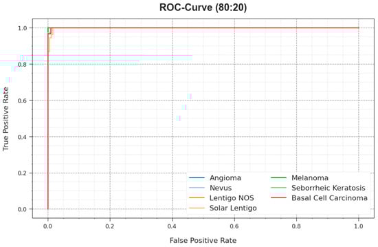 The ROC curves offered by the ODL-SCDC model at 80:20 of the TR phase/TS phase are illustrated in Figure 9, which have the ability the discriminate the class labels. The figure implies valuable insights into the trade-off between the TPR and FPR rates over distinct classification thresholds and varying numbers of epochs. It presents the accurate predictive performance of the ODL-SCDC system on the classification of various classes.