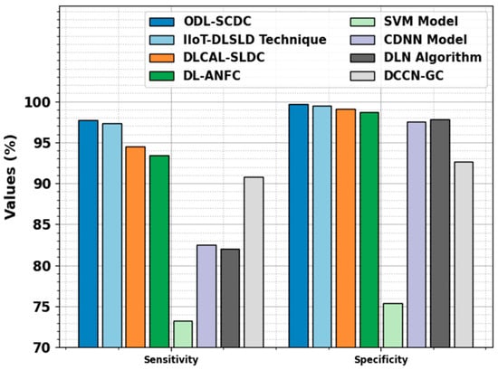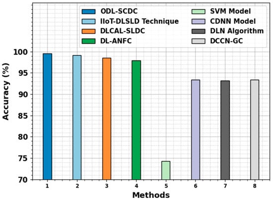 In Table 4, a comprehensive comparison study of the ODL-SCDC technique is made []. Figure 10 represents the comparative results of the ODL-SCDC technique in terms of . Based on , the ODL-SCDC technique gains an increasing of 99.55%, whereas the IIOT-DLSLD, DLCAL-SLDC, DL-ANFC, SVM, CDNN, DLN, and DCCN-GC models obtain decreasing values of 99.20%, 98.50%, 97.90%, 74.30%, 93.40%, 93.20%, and 93.40%, respectively.
