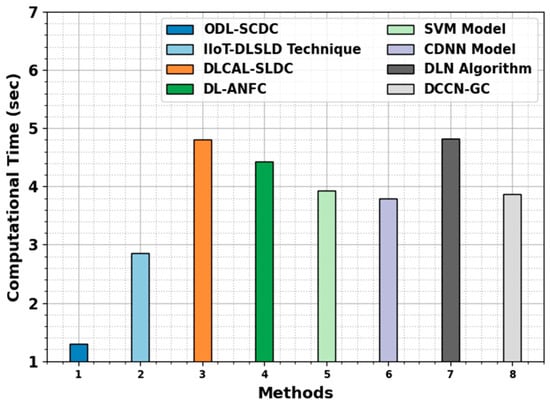 Lastly, the computation time (CT) results of the ODL-SCDC technique are compared with recent models in Table 5 and Figure 12. The experimental outcomes infer the lowest CT value of the ODL-SCDC technique with 1.30 s. On the other hand, the IIoT-DLSLD, DLCAL-SLDC, DL-ANFC, SVM, CDNN, DLN, and DCCN-GC models obtain increasing CT values. Therefore, the ODL-SCDC technique exhibits effectual performance of skin cancer classification.