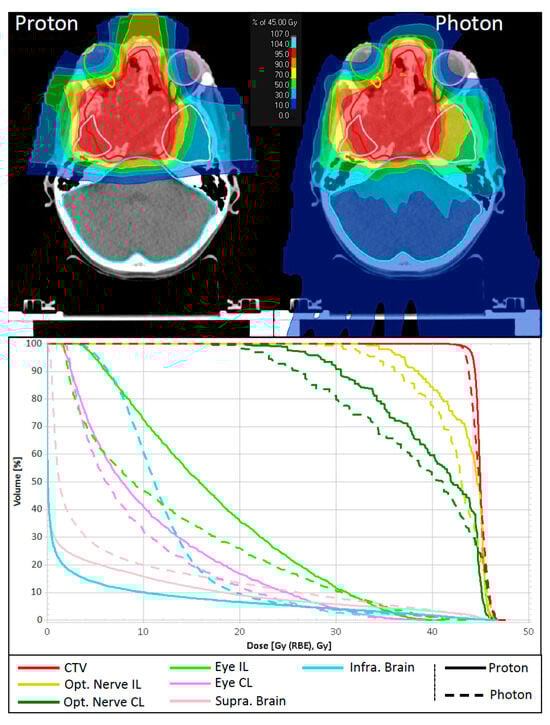 Comparison of dose distribution and dose volume histograms between a proton treatment plan and a helical photon therapy plan for a representative patient. CTV and selected OAR are shown. CTV: clinical target volume; Opt. Nerve IL/CL: ipsi- and contralateral optic nerve; Eye IL/CL: ipsi- and contralateral eye; Supra. Brain: supratentorial brain; Infra. Brain: the infratentorial brain.