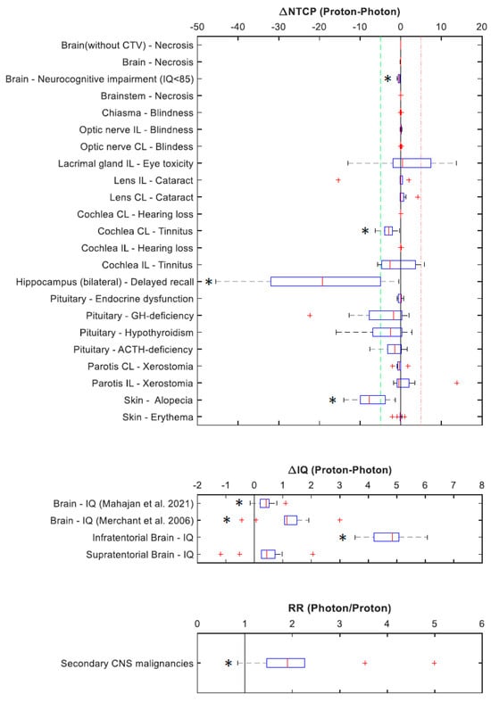 The absolute differences in NTCP values (∆NTCP), IQ (∆IQ), and RR for secondary CNS malignancies are illustrated in Figure 2 and detailed in Supplementary Materials Table S4. A subset of those values is presented in Table 4. Significant differences in NTCP values were most importantly related to the brain, the skin, and the auditory system. Less dose deposition in bilateral hippocampi and infratentorial brain in proton plans translated with significantly improved estimates for delayed recall (∆NTCP of 20%) and IQ (∆IQ of ~5 points), respectively. Favourable dose distribution to skin and the auditory system predicted better outcomes for alopecia (∆NTCP of ~7%) and tinnitus on the contralateral ear (∆NTCP of ~3%). The average estimated risk of radiation-induced secondary CNS malignancies was about two times higher for photon plans compared to proton plans, and in certain scenarios, it increased up to five times higher.