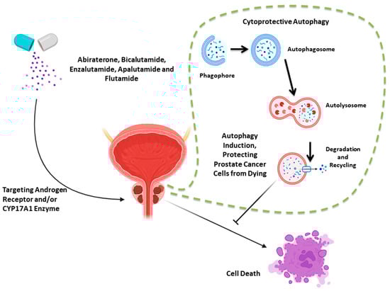 Autophagy induced in response to androgen-targeted therapies. Androgen-targeted therapies (abiraterone, bicalutamide, enzalutamide, apalutamide, and flutamide) exert their effects on prostate cancer cells via androgen receptor blocking and/or targeting the CYP17A1 enzyme. These agents, however, induce a cytoprotective form of the autophagic machinery (autophagy steps: formation of phagophore, then autophagosomes, fusion between autophagosomes and lysosomes, forming autolysosomes in which the cargo is degraded), which protect the prostate cancer cells from undergoing cell death.